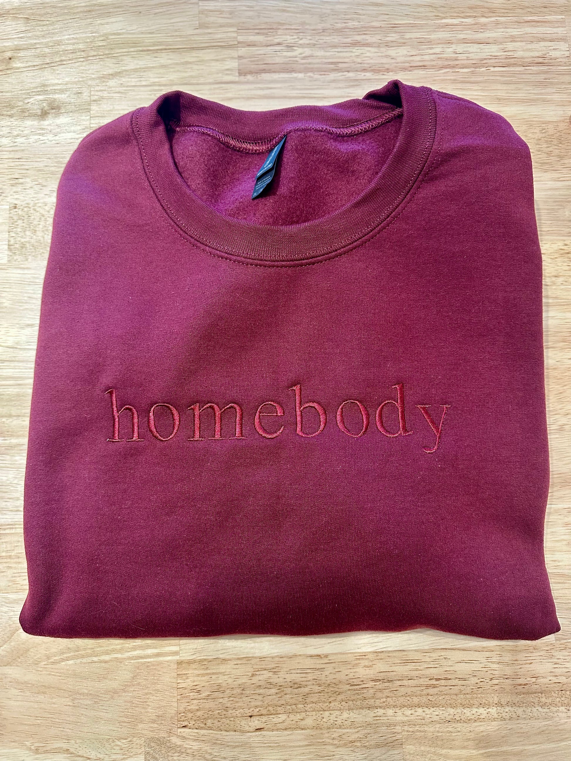 Wrap yourself in cozy, laid-back charm with our embroidered Homebody crewneck. Crafted in a rich maroon hue, this shirt is the perfect blend of comfort and style. The front features delicate, high-quality embroidery that adds a subtle, elevated touch—ideal for anyone who loves staying in, winding down, and embracing the simple pleasures of home.